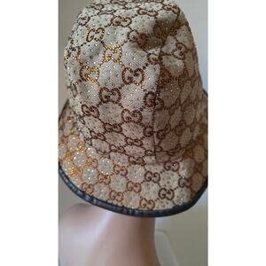 Enhance your style with this fashionable Gucci bucket hat in a neutral GG pattern. The studded crystal embellishments add a touch of elegance to any outfit. Includes tags and dust bag for safekeeping. Perfect for any occasion.