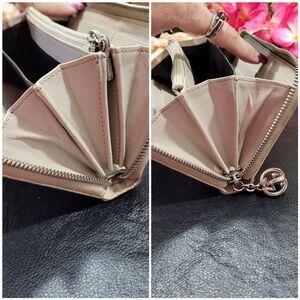 Please review all photos as there are some callouts on the wallet. This is not brand new and has been used. There is slight discoloration from age and use. The edges show some signs of wear but it is not extreme. The zipper is intact and works perfectly. There is minor rubbing and wear on the top corners as well. Inside is in good condition, there is not any real signs of wear, use or damage inside. There is so much space and organization in this wallet. Compact and luxurious.