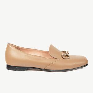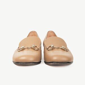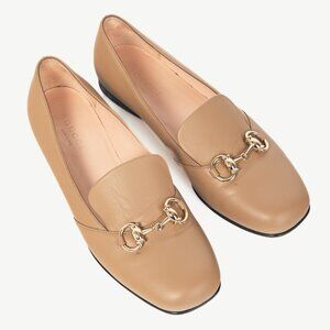 Made in Italy, these loafers from Gucci are crafted in a beige leather, and feature flat block heels, closed rounded square toes, gold-tone horsebit detailing, and leather lining and soles.