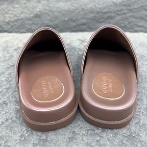 Elegant Gucci clogs with signature beige monogram. Features gold hardware and brown accents. Ideal for chic fashion.