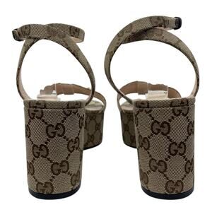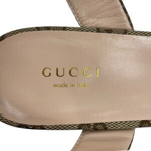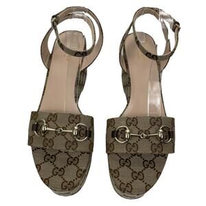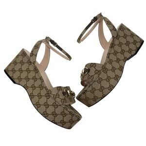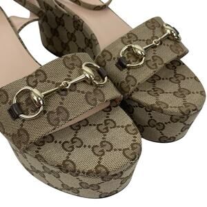 Stylish Gucci platform sandals in beige. Features iconic monogram design. Perfect for elevating any outfit.