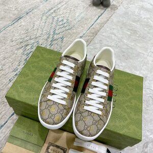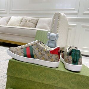 Stylish Gucci sneakers in beige with iconic red and green stripes. Features a unique design with a touch of red on the heel.