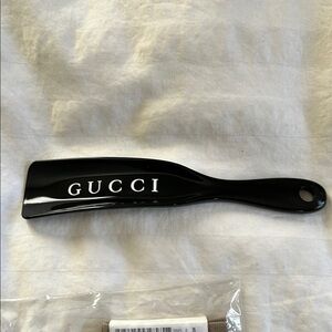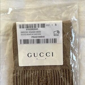 Stylish Gucci socks in a beige color. Perfect for adding a touch of luxury to your outfit. Brand new with tags. Women’s size small. Comes with Gucci shoe horn.