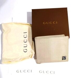This authentic GUCCI beige leather wallet offers sleek functionality and timeless style. Measuring 4x3.75 inches, it features multiple compartments including a snap coin slot, bill compartments, and credit card slots for organized storage. Accompanied by its original box and dust bag, this wallet is a sophisticated addition to any collection.