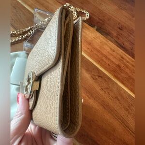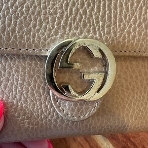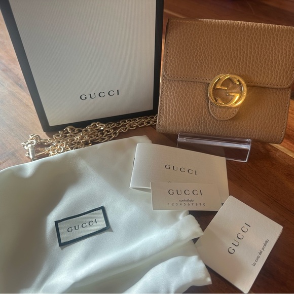 Gucci Beige Trifold Wallet with Gold Accent with gold Chain, Box and Dust Bag