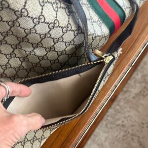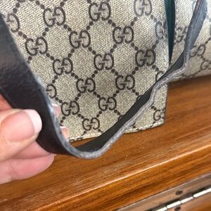 Stylish Gucci tote with iconic GG pattern. Features beige canvas and black leather accents. Red and green stripe detail adds elegance. PLEASE SEE PICS! Obvious wear