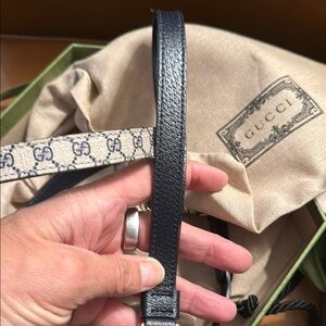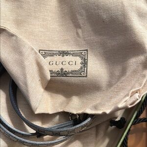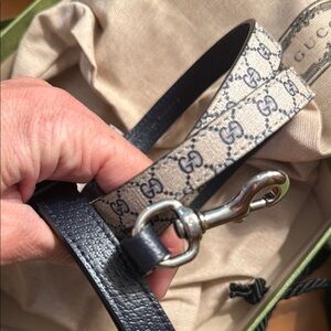 Stylish Gucci dog leash. Beige with blue accents. Durable and elegant design.