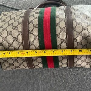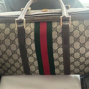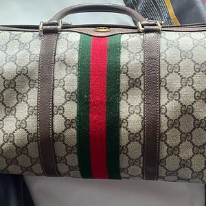 Elegant Gucci duffel bag. Beige with iconic brown pattern. Features bold red and green stripes. Ideal for travel.