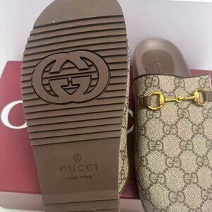 Elegant Gucci slides with iconic logo pattern. Ideal for everyday comfort.