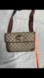 Elegant Gucci bag with signature monogram. Features a beige and brown design. Accented with a green and red strap.