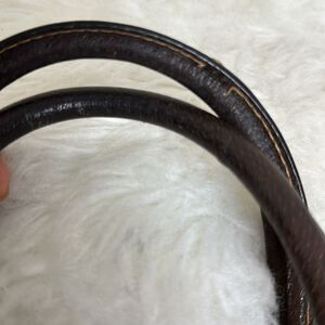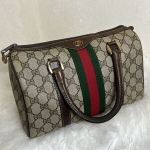 Stylish Gucci bag with iconic monogram pattern. Features red and green stripe detail. Durable brown leather handles and trim.