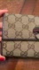 Elegant Gucci clutch with signature monogram. Features beige and brown tones with green and red stripe detail. Has a little wear on the corners