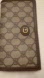 Elegant Gucci clutch with signature monogram design. Features beige and brown tones. Iconic logo detail.