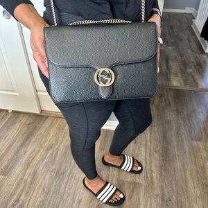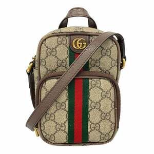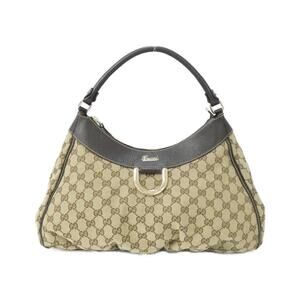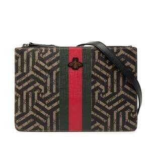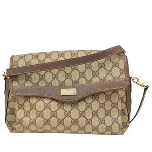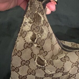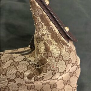 Chic Gucci shoulder bag with iconic monogram design. Features elegant gold accents and sturdy handle. Ideal for stylish outings.