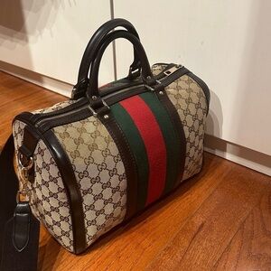 Elegant Gucci satchel with signature monogram. Features bold green and red stripe. Perfect for any occasion.