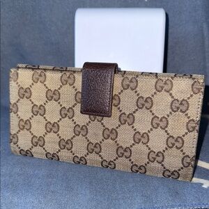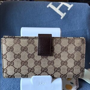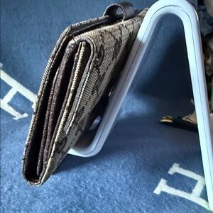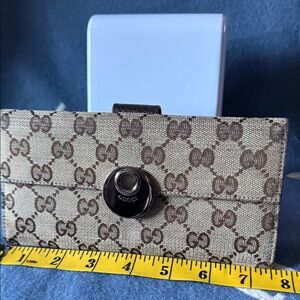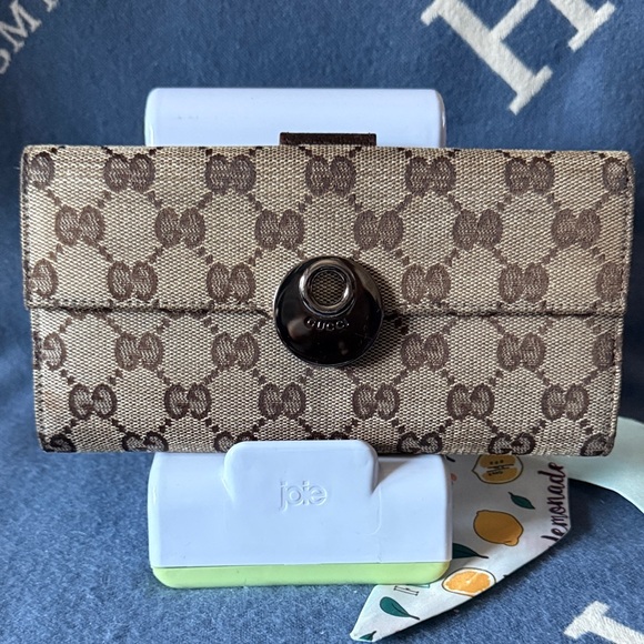 Chic Gucci wallet with iconic monogram pattern. Features a sleek design and secure closure.