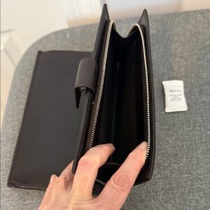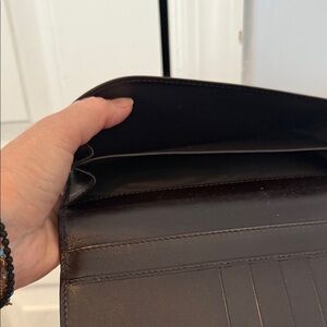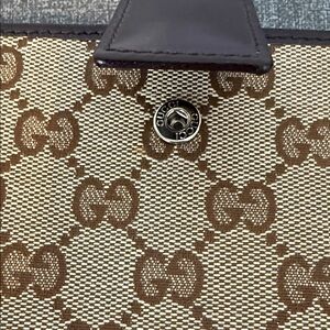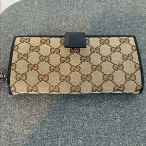 Gucci GG canvas wallet with iconic monogram pattern. Features a beige and brown color scheme.Brand new, no box no receipt, never used, it has credit card slots, zip compartment, snap closure, approximate 7.5 inches wide, will go to authentication if 500 or more, i am original owner, was a gift from a Gucci store, never used, a very faint spot near the snap when opened but cant really see it, ( arrived like that)