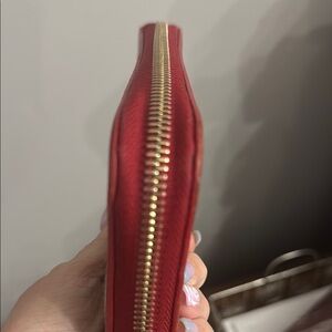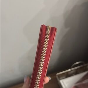 Elegant Gucci wallet featuring a classic beige and brown pattern. Accented with a striking red trim.