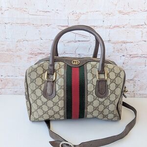 Elegant Gucci satchel. Beige with brown leather accents. Iconic green and red stripe. Perfect for any occasion.