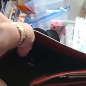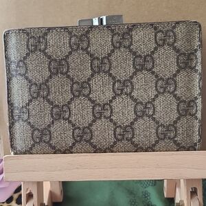 Stylish Gucci wallet with iconic pattern. Features a textured brown clasp. Perfect for everyday use.