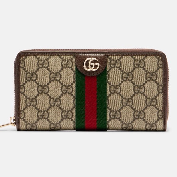 Stylish Gucci wallet featuring signature GG pattern. Accented with green and red stripe. Perfect for a touch of elegance.