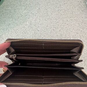 This item is worn but in good condition. There is visible light wear on corners and hardware, and stitching on one side of interior card holder section is undone (not visible from outside).