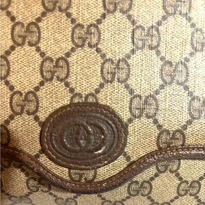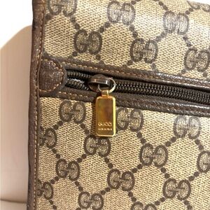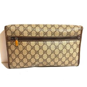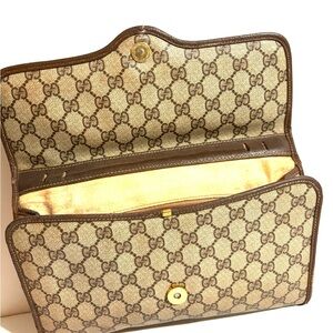 Elevate your style with this elegant Gucci clutch bag. Featuring a classic beige and brown design, this bag is perfect for any occasion. The iconic Gucci pattern adds a touch of luxury to your ensemble.main compartment 1 zip pocket at interior wall lining have tear stains exterior have stains corner have tear cracks hight 6.5” wide 11” depth 1”The dimensions are based on approximately measurements before placing an order please check take a moment to view all photos using feature for a closer look
