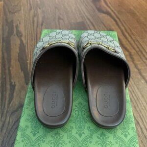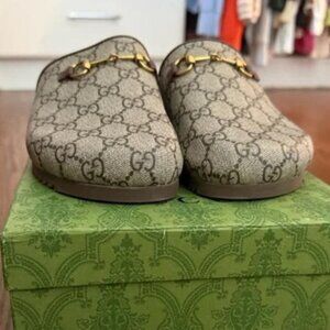 Elegant Gucci mules with signature horsebit. Beige and brown GG pattern. Ideal for chic style.