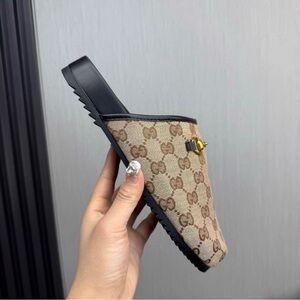 Elegant Gucci slippers with signature pattern. Features gold-tone hardware. Comfortable and stylish.