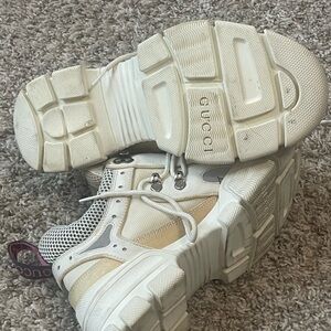 Stylish authentic Gucci sneakers in beige and gray. Perfect for casual wear.