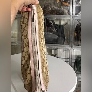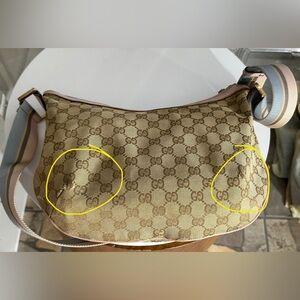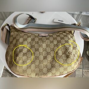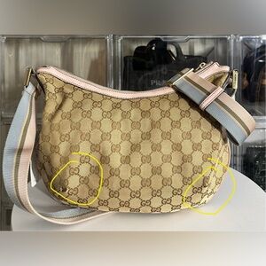Authentic Gucci women's crossbody bag in beige with pink accents. Good condition . Flaws to the both bottom corners they are scratched but no holes pls check the photos they are also circled to shows where they are. Sling strap is still great condition , interior lining clean.