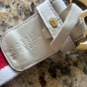 Ivory, red and navy canvas Gucci belt with ivory leather trim, gold-tone GG hardware and peg-in-hole closure. Designer size 75. Includes dust bag. Condition very good. Length Min: 28"