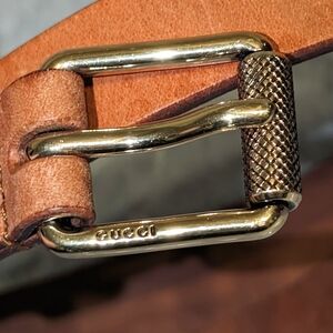 Gucci on Buckle, in Gold Tone Letters on Belt, and on buckle flap