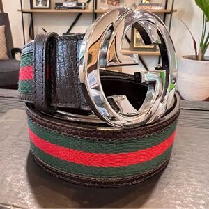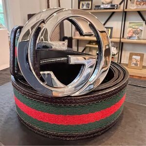 This Gucci belt web-line in good condition wear on holes and a couple of kinks in leather interior