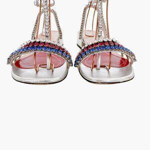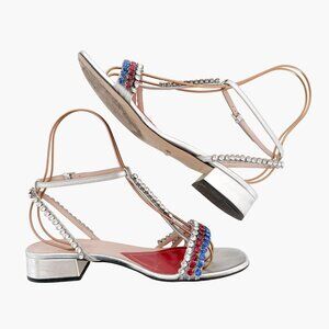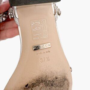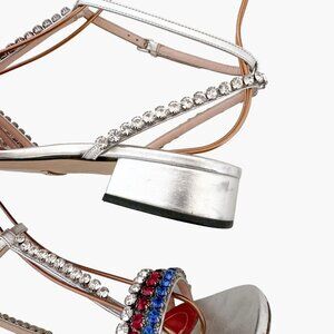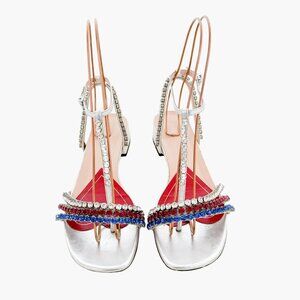 Gucci Bertie Crystal T-Strap Flat Sandals EU 37.5 US 7.5 Silver Red White Blue