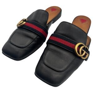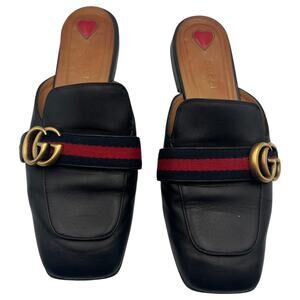 Gucci Betis Glamour Nero GG Web Peyton Leather Slip On Flat Mules Black 38 / 8