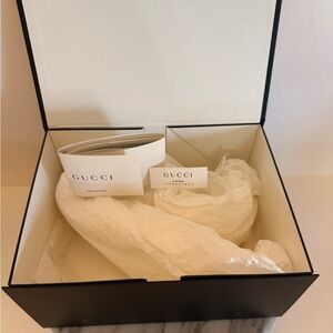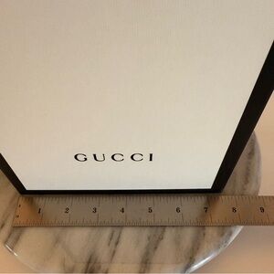 The Gucci Black and White Empty Storage Gift Box is a medium-sized gift box designed by the luxury brand Gucci. With a sleek black and white color scheme, this gift box is perfect for storing small items like jewelry, bracelets, or other small gifts. The sophisticated design and branding make it a desirable option for gift-givers looking to present their presents in a stylish and high-quality packaging.