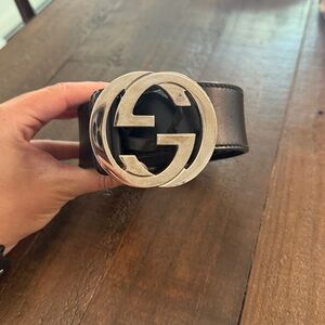 Elegant Gucci belt in black leather. Features a striking gold buckle. Ideal for elevating any look.