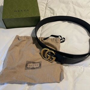 Sophisticated Gucci belt in black leather. Features iconic gold GG buckle. Perfect for any ensemble. Perfect condition