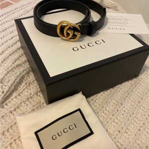 Elegant black belt with iconic gold GG emblem. Elevates any ensemble.