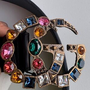 Elevate your style with this elegant black belt featuring a stunning multicolor gemstone buckle. Perfect for adding a touch of glamour to any outfit.