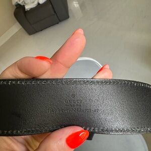 Chic Gucci belt in black leather. Features a shiny silver emblem. Adds elegance to any look.