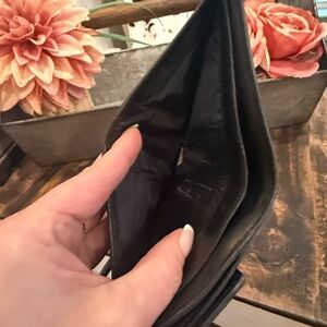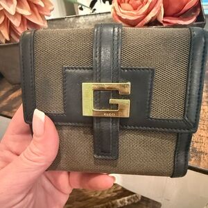 Black and Brown wallet by Gucci. Authentic vintage piece! The brown portion is a fabric and has some marks. The gold is very vibrant with embossed Gucci logo detail on it. There is also black leather trim as well as on the interior. There is some light coin residue in the coin pocket. The back snap does not close (see photo). 10 card slots, 2 long pockets for bills. Normal signs of wear but overall good to go!