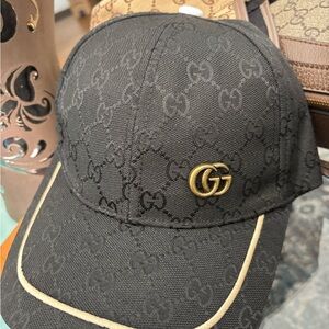 Elegant Gucci cap featuring a monogram pattern. Accented with a gold logo.