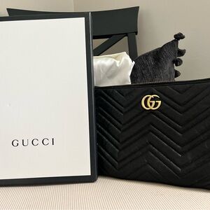 This sophisticated Gucci clutch features a striking black chevron quilted design, accentuated by the iconic gold-tone GG logo. Crafted from premium leather, it offers a luxurious touch and a sleek matte finish. Ideal for adding a touch of elegance to any ensemble, this clutch is a must-have accessory for the fashion-forward individual.
