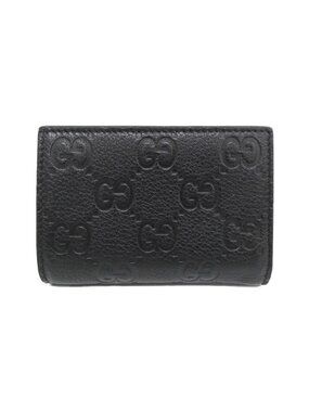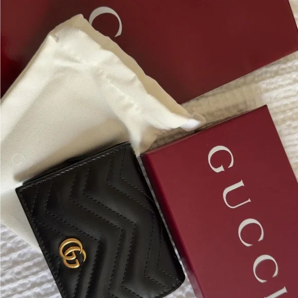 Black chevron-quilted leather card wallet. Features signature gold double-G logo. Compact and elegant design. Ideal for daily cards and cash.