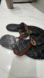 Elegant Gucci flip-flops with embossed black soles. Features signature red and green straps.