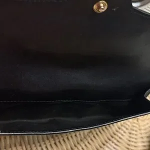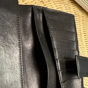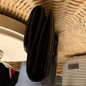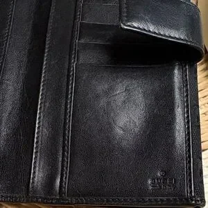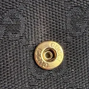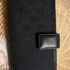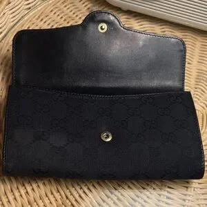 Elegant Gucci continental wallet in black GG canvas with leather trim. Features polished gold-tone horsebit accent across the front. Streamlined silhouette for organized storage and refined style. Pre owned. See photos , zoom in for part of description. Vintage.