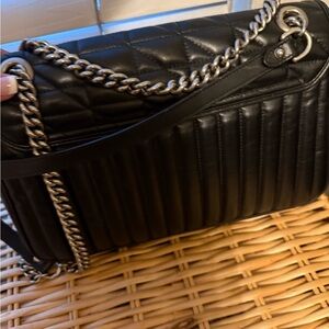 The Gucci GG Marmont shoulder bag in black showcases a luxurious quilted chevron pattern, complemented by the iconic double 'G' logo in antique silver. Its structured flap design and chunky chain strap add a touch of elegance to any ensemble. Please note very light makeup stains on inside. Will come with box and bag. 100% authentic- I spent almost $2500 on this bag 1.5 years ago and have fallen on hard times. My
