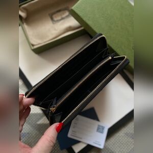 Black wallet from Gucci. Crafted in ‘GG Matelasse’ leather, this design features a zip fastening, gold-tone logo hardware and three bill compartments, one zip pocket and twelve card slots inside.